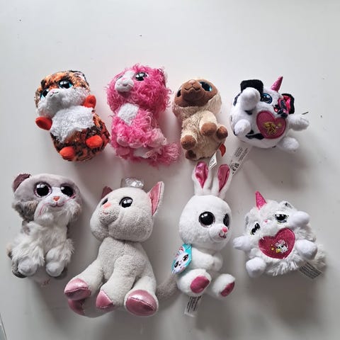 9 meget velholdte tøjdyr i forskellige størrelser, herunder en lille kanin med klemme på, fra TeddyKompaniet.