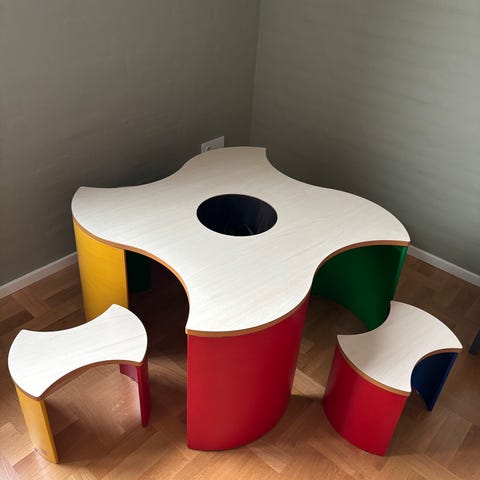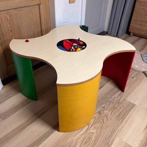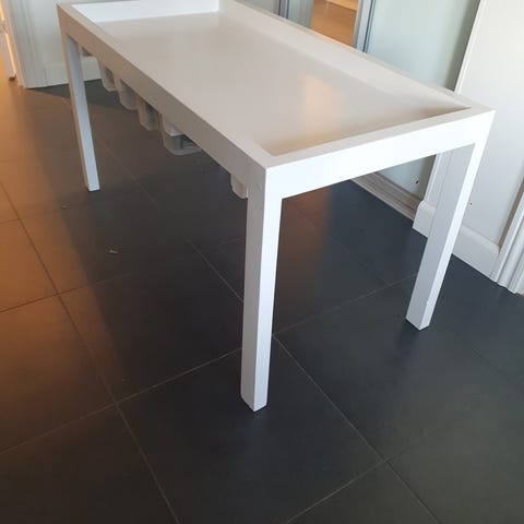 IKEA legobord med 18 opbevaringsskuffer. Bordet er designet til organisering og opbevaring af Lego eller andet legetøj. Bordpladen er flad og egnet til leg eller kreative aktiviteter. Det måler 113*87 og et lille klapbord kan slåes ud i den ene ende, så der er ekstra plads til leg.