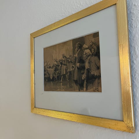Tegningen er indrammet i nyforgyldt ramme, udført for et par år siden, og fremstår præsentabel og klar til ophængning.