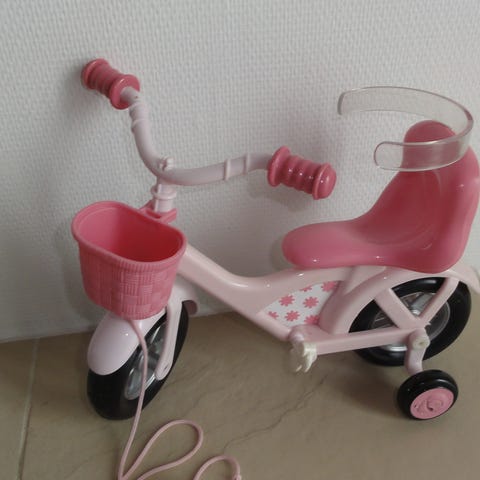 New Born Baby dukke cykel med styr og hjelm. Cyklen har et sæde med ryglæn og håndtag til skubning. Hjelmen er pink med justerbare stropper og egnet til dukker.