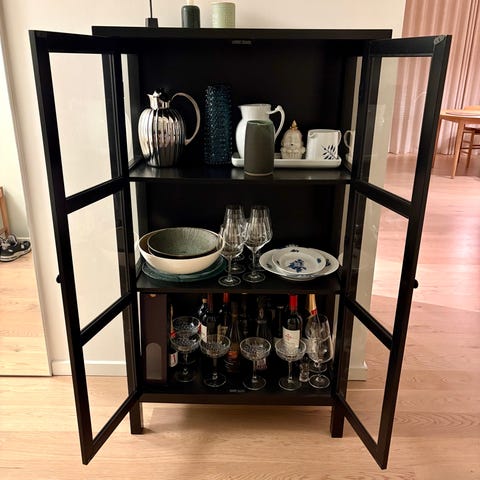 Skabet er i sort træ og har mørkt, tonet glas i lågerne, som giver et fedt udtryk. Vi har selv brugt det som barskab, hvilket det fungerer rigtig godt til.