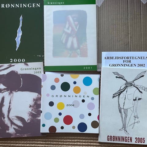 8 Grønningen kataloger fra 1980’erne - minus 80 og 82. 21 x 28 cm. Mellem 72 og 114 sider. Alle på glittet papir og med arb.fortegnelse - undt.1986, som har original litos af Peter Brandes, Sporring og 2 af Mogens Andersen.(125 alene). Pris for alle: 400.