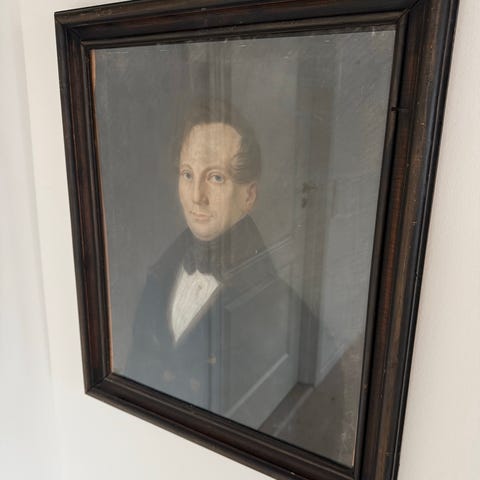 Jeg tror maleriet er af nyere dato, men det er malet på ældre lærred. Der ses slitage langs kanten på lærred som dog indikerer noget alder, men der er ingen signatur eller noget der kan bringe os på banen af noget.