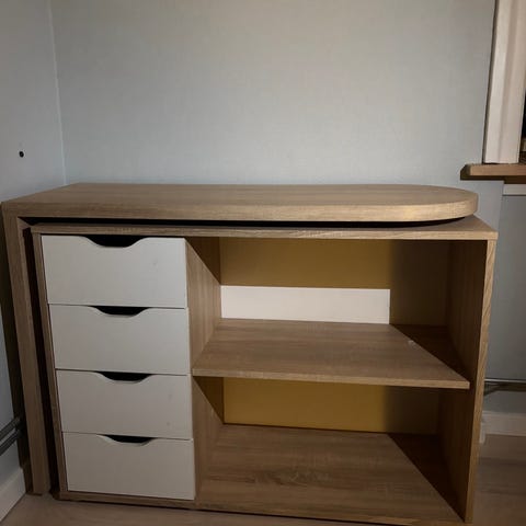 Foldbar skrivebord i lyst træ med 4 hvide skuffer fra Jysk. Sparer plads når det ikke er i brug.