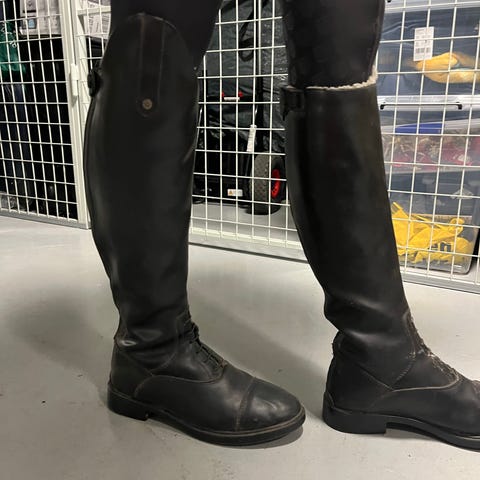 Ridderstøvler i sort læder med justerbar rem ved anklen og knæet. Støvlerne er designet til ridning og har en robust sål og hæl.