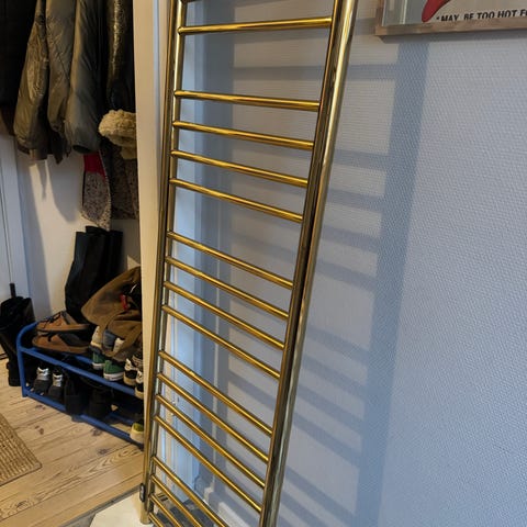 Håndklædetørrer i krom med gulddetaljer, monteret på væg. Designet til opvarmning og tørring af håndklæder i badeværelset. Materialet er hovedsageligt krom med dekorative gulddetaljer ved samlinger og beslag.
