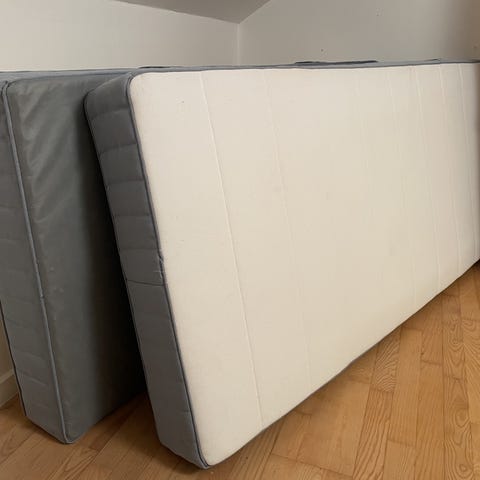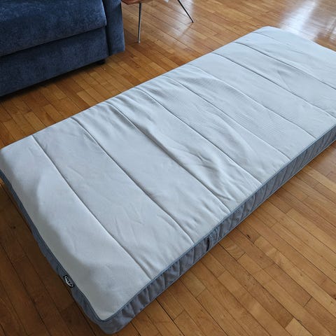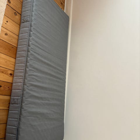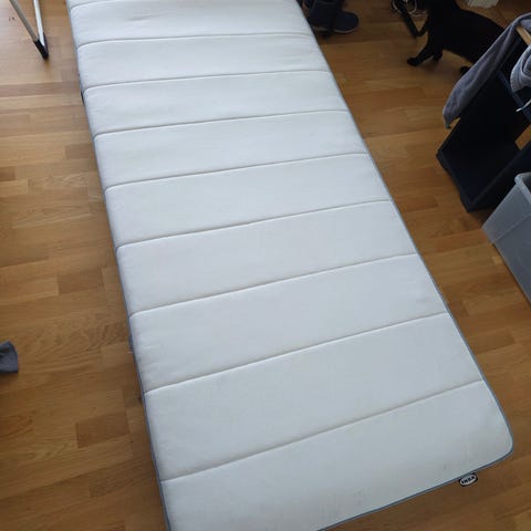 Springmadras med pocketfjedre, fast/lyseblå, 80x200 cm. Meget lidt brugt da den var til gæster. Skal hentes. Førpris 899kr. Topmadras (købt for 350kr) medfølger.