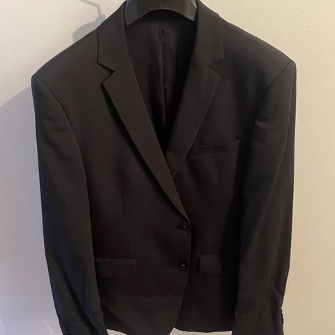 Sort jakkesæt fra Bruuns Bazaar i uldstof str. 52. Sættet er brugt men i virkelig god stand. Afhentes i KBH K