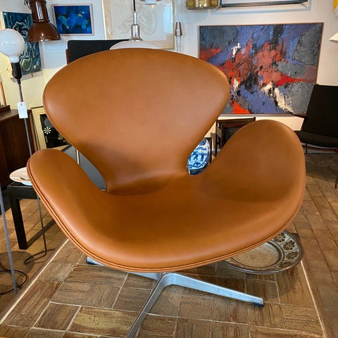Synes du også det er kedeligt at have et møbel stående du kan gå ned og finde en magen til i møbelforretningen så kan du købe en Svanen stol fra 69 med original læder . Ligeledes i den rigtige farve . Den har den originale profilerede fod .