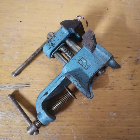 Gammel metal skruestik med tilbehør