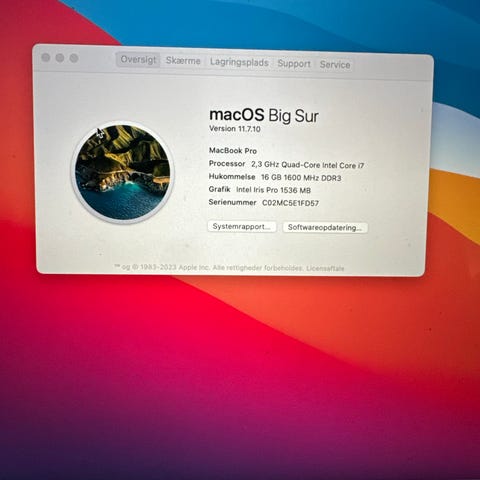 Apple MacBook Pro 13" (Retina, 15-inch, Late 2013) laptop med 2,3 GHz Quad-Core Intel Core i7 processor, 16 GB 1600 MHz DDR3 hukommelse, Intel Iris Pro 1536 MB grafik og macOS Big Sur operativsystem.