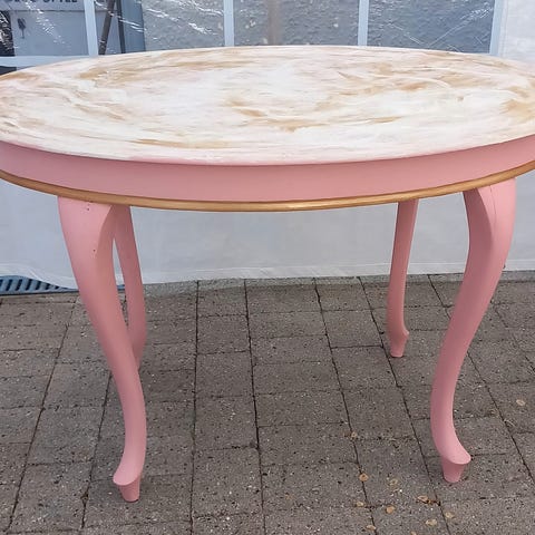 Super fint og robust rosafarvet spisebord. Ovalt og med to tillægsplader, så der er god plads til 10 personer omkring bordet, når det er slået ud. Malet hos professionel sprøjtemaler. Selve bordpladen bærer præg af brug, men der er ingen dybe ridser eller skrammer - kom gerne og se det 😊