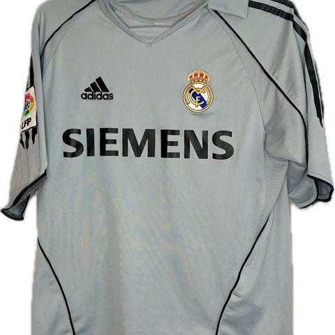 Der var en særlig lethed over Real Madrid i begyndelsen af 00’erne. Klubben var centrum for fodboldverdenen, og selv udebanetrøjerne bar præg af storhed og genkendelighed. Denne hvide og sorte fodboldtrøje med Siemens Mobile på brystet stammer fra netop den periode, hvor Galácticos-æraen satte sit tydelige aftryk på europæisk fodbold.