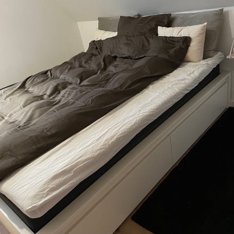 Sengestel og madras er fra IKEA det hedde TRYSIL normalt følger skufferne ikke med men jeg har modificeret benene så skufferne fra IKEA MALM passer