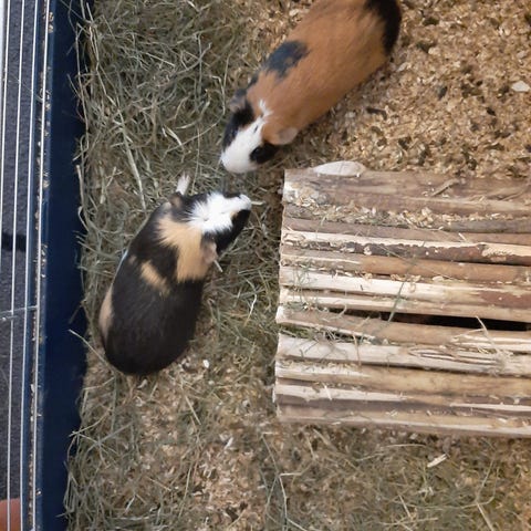 Vi sælger vores to søde marsvin og deres hjemmebygget bur. Børnene og jeg har haft marsvin de sidste 5 år, men interessen er aftaget og vores sidste marsvin her, fortjener at blive taget mere op og snakket med, end de bliver hos os. Marsvinene er 2 og 1 år gamle, hanner og super søde og snakkende. De reagere når køleskabet åbnes og er vant til at blive nusset med, dog efterhånden mest mens de er i buret. Buret er i tre etager og fungere rigtig godt til dem. Det lille skab det står på kan medfølge og har plads til hø, tørfoder og deres ting. Seler, nusse-rede, negleklipper, udendørs hegn til græsning og lille transportboks medfølger.