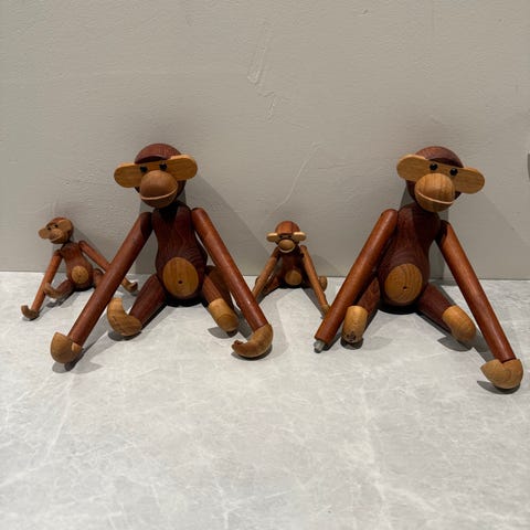 Kay Bojesen Abe træfigur lavet af træ. Figuren har bevægelige arme og ben og er designet med en kombination af lyst og mørkt træ.
