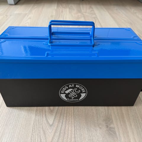 legetøj værktøjskasse i træ med forskellige tilbehør såsom skruetrækker, hammer og skruer. Designet til børn og fremstillet i træmateriale. Indeholder flere farvede værktøjer til leg og læring.