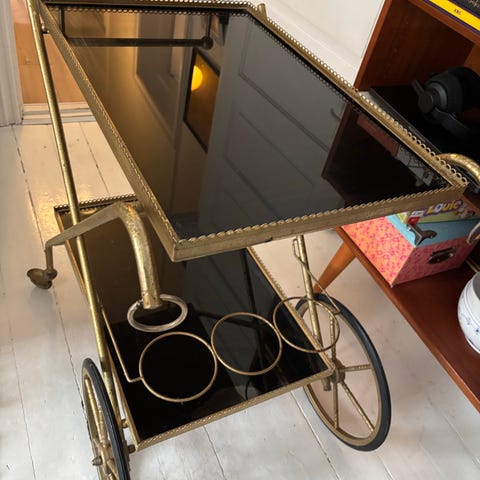 Vintage serveringsvogn med glasplader og messingramme. Barbord