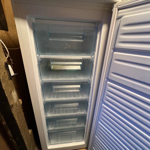 Den fungerer fint og fryser som den skal. Der er dog nogle småting: to hylder sidder ikke ordentligt fast og er derfor bundet, og fryseren kan danne en del is. Mål: 150 × 60 × 60 cm. Skal afhentes.