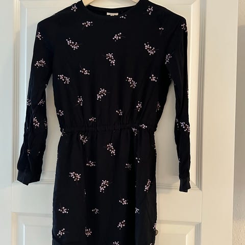 Helt Ny lilla kjole fra pompdelux str 170. Hillside yo dress. Lilla med hvide og guld prikker og guldglimmer kant. Fint snit med elastik i livet og lommer.