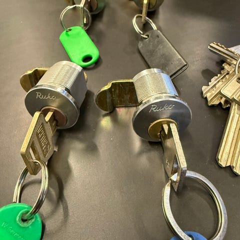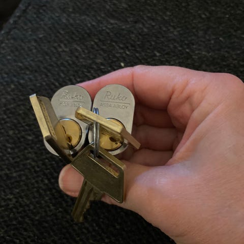 Ruko cylinderlåse + postkasse cylinder med tilhørende nøgler (alle låse bruger samme nøgle). Cylindrene er i rustfri stål og velegnede til brug i yderdøre, hvor der er behov for sikker låsning. Det er Rukos serie 600. Alle låse og nøgler fungerer uden nogen som helst problemer. Er skiftet ifm flytning.