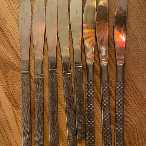 Hackman Sorsakoski finsk design knive (6) og gafler (6) fra 1950’erne. I god stand. Stainless steel, 175 mm (gaffel), 205 mm (kniv). 15 kr. per styk, så 180 kr. for hele sættet. Afhentes fra Frederiksberg.