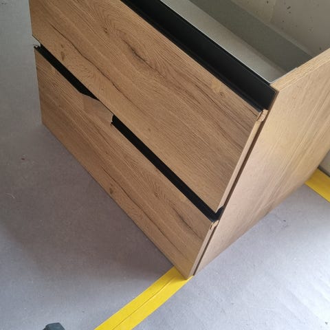 Badeværelsesskab og vaskeskab i træ med sort bordplade