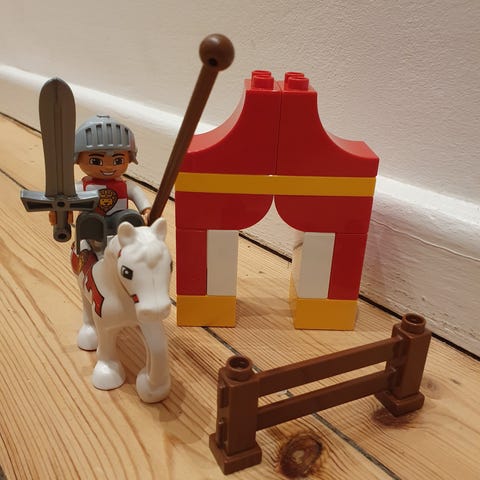 LEGO DUPLO Kingdoms legetøj med en ridderfigur, hest og tilbehør som et telt og et sværd. Passer til små børn og stimulerer rolleleg og fantasi.