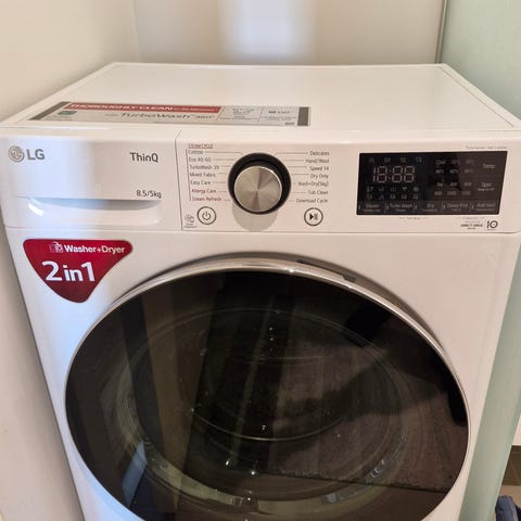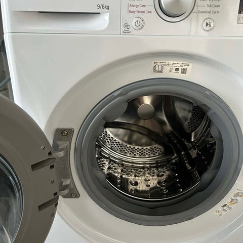 LG ThinQ kombineret vask/tørring med frontbetjent tromle i rustfrit stål. Maskinen har flere vaske- og tørreprogrammer og digitalt kontrolpanel. Ca. 3 år gammel.