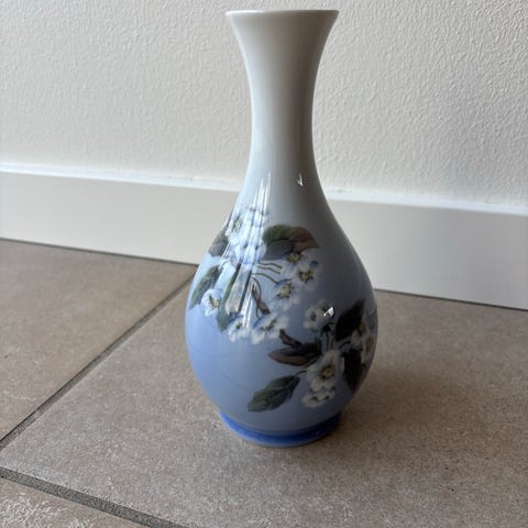 Den anden vase har et motiv af liljekonvaler fra B&G højde 13,5 cm blå og hvide farver.