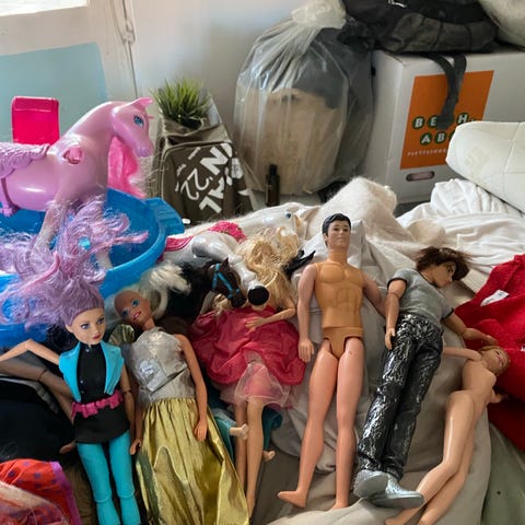 Barbie dukker og tilbehør inklusive forskellige dukker, tøj, små babydukker, heste og møbler. Sættet indeholder mange Barbie-dukker med forskelligt tøj og tilbehør i forskellige størrelser og farver. Der er gammelt og nyt blandet og to kasser med ekstra tøj og udstyr. En kæmpe blandet landhandel til en meget god pris.