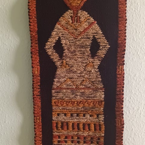 Håndvævet vægtæppe med geometrisk mønster og frynser / vintage