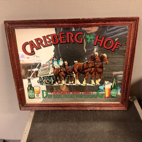 Flot og originalt Carlsberg HOF spejl med klassisk bryggeri-design. Et ægte stykke dansk ølhistorie, perfekt til bar, herreværelse eller samling af Carlsberg reklamer og øl memorabilia.