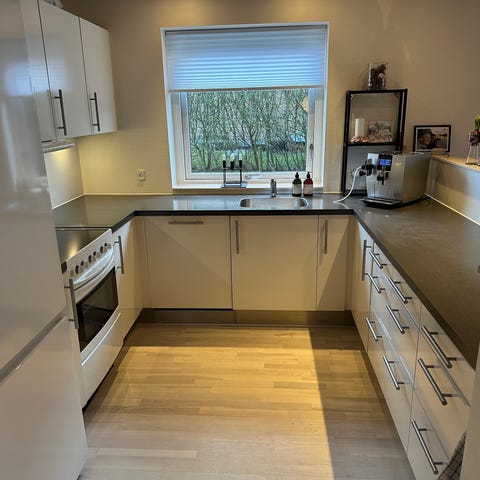 Der er skåret hul i skab ved vask samt over køleskab, for at gøre plads til affaldssortering og mikroovn.