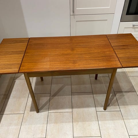 Dansk design fra 1960’erne. To udtræksplader medfølger - så bordet kan blive 235 cm langt. Benene kan skrues af. Passer godt til mindre bolig.