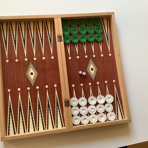 Manopoulos Skak-, Backgammon sæt. Håndlavet af valnøddetræ. Sættet indeholder et foldbart spillebræt med skak og backgammon-bræt. Fremstillet i valnøddetræ med håndlavede brikker. Produceret i Grækenland. Aldrig brugt.