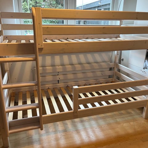 Flexa køjeseng i lyst træmateriale. Sengen har en robust konstruktion med lamelbunde og inkluderer en stige til adgang til øverste seng. Designet til børn og egnet til børneværelser. En enkelt lamel er knækket se billedet, den kan repareres eller udskiftes. Madras str. 90 x 200, der medfølger ikke madrasser. Fra ikke ryger hjem. Sengen er ikke samlet.