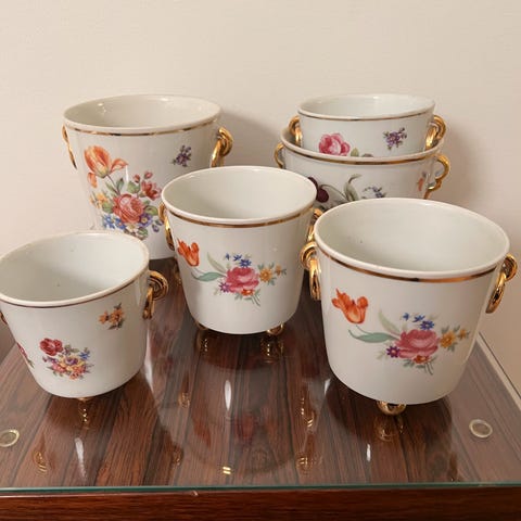 Vintage porcelænsurtepotter eller urtepotteskjulere med blomstermotiver og gulddetaljer i flere størrelser.