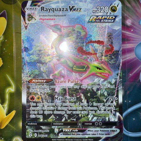 Pokémonkort: Rayquaza VMAX URR fra 2022 Sword & Shield Silver Tempest Trainer Gallery. Kortet er bedømt af Beckett Grading Services og har fået karakteren Pristine 10.