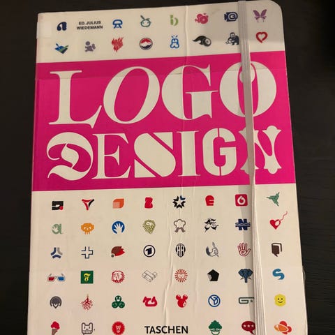 Opslag med designede logoer, firmanavne og akkrediteret til hvem. God inspiration til logodesign
