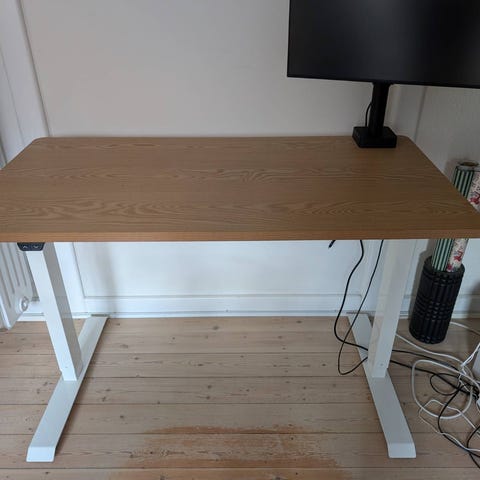 Elektrisk justerbart hæve sænke skrivebord af høj kvalitet med kabelhul i bordpladen. Bordet har et T-stel med antikollision og justerbare fødder. Drives af to kraftige motorer.