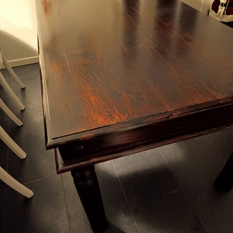 Små brugsspor. Der medfølger 2 plader a 50 cm bredde stykket, så bordet kan blive 260 cm.
