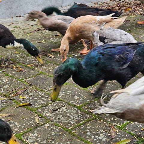 To ænder og to andrikker. De er vant til stor fritgående have og dejlige svømmebassiner. Kommer når man kalder. De er i æglægning.