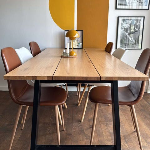 Virkelig flot spisebord med sorte kunstlæderstole.