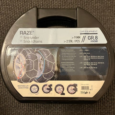 Kraftige snekæder. Pakket ud men aldrig brugt. Dækstørrelserne som de passer til fremgår af tredje billede.