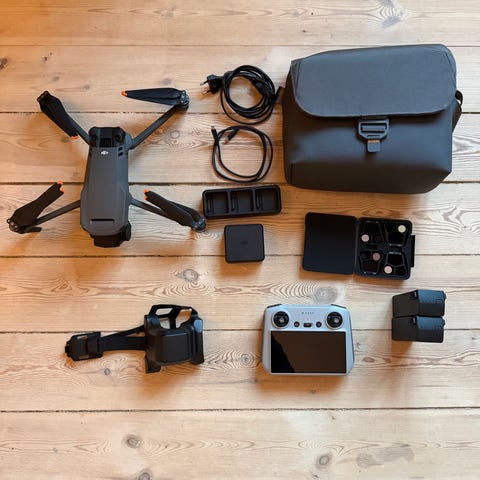 DJI Mavic 3 dronepakke med omfattende tilbehør inklusive ekstra batterier, oplader, forskellige kabler, propeller, fjernbetjening og en opbevaringstaske. Velegnet til luftfotografering og videoproduktion.