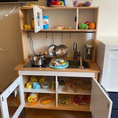 IKEA børnekøkken i træ med integreret ovn, kogeplader og vask. Køkkenet har flere skabe og hylder til opbevaring. Det er lidt pletter mv. - se billeder.