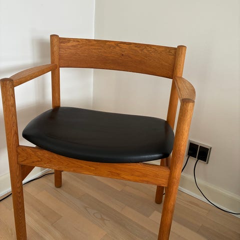 Fin, enkel læder lænestol i sort skind. Læderet er intakt, men i bunden er der et par slidmærker (se billede). Stolen er designet af Erik Wørts, og er fra FDB serien, nummer L603