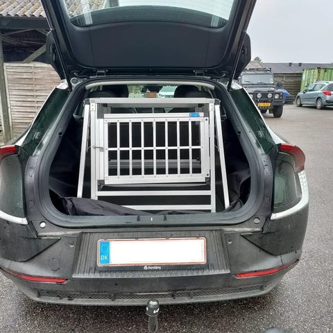 Bemærk at buret hælder bagtil så det udnytter pladsen op i mod bagsædet, og derfor kan være i flere bil modeller end vores hundebur "Enkelt XL Standart" som er 90 grader bagtil.