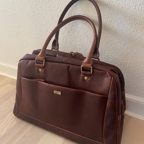 taske i læder med sort mønster. Tasken har to håndtag, en aftagelig skulderrem og lynlås. Designet til unisex brug.